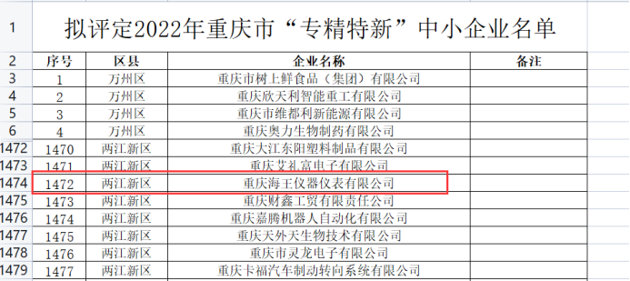 海王儀表被評定為重慶市“專精特新”中小企業(yè)