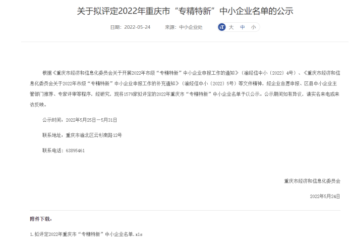 近日,重慶市經(jīng)濟和信息化委員會公布了2022年度重慶市“專精特新”中小企業(yè)名單,我公司被評定為重慶市“專精特新”中小企業(yè)。